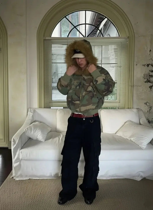 Y2K Streetwear Camouflage Hooded Fur Jacket