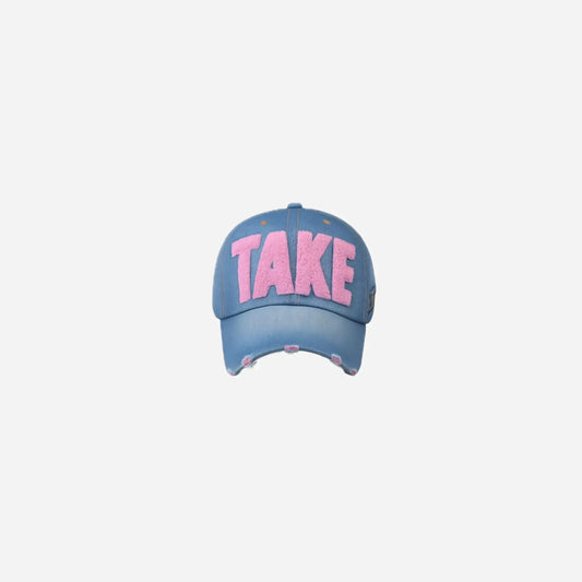 Distressed Embroidered Puff Denim Trucker Cap - Pink