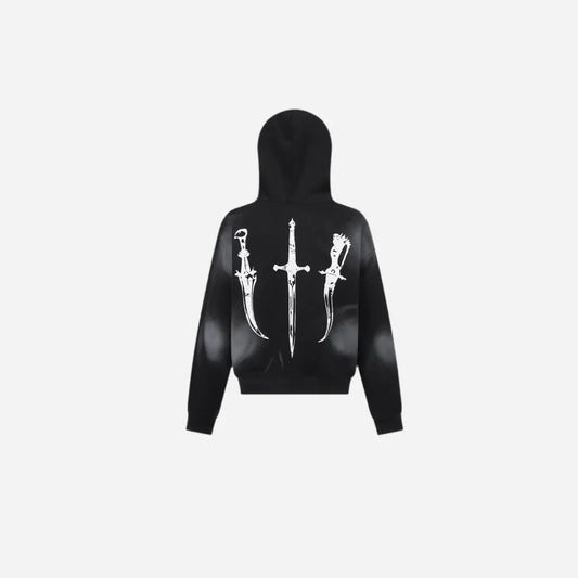Gothic Washed Fur Hooded Zip Hoodie - Black