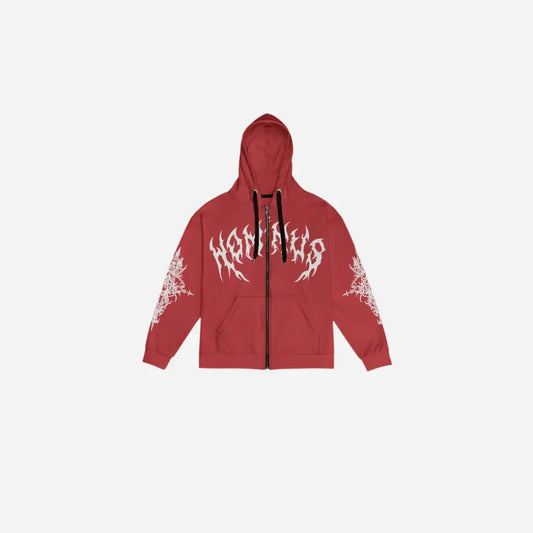 Y2K Washed Retro Gothic Flame Print Oversized Zipper Hoodie - Red