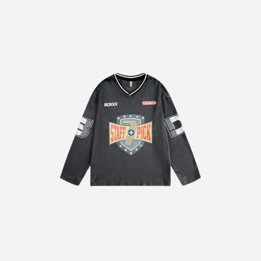 Vintage Oversized Long Sleeves V Neck Jersey Tee - Black