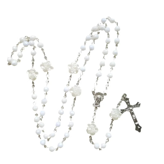 White Rose Rosary Flower Cross Necklace