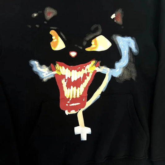 Y2K Washed Retro Gothic Flame Print Oversized Zipper Hoodie - Black